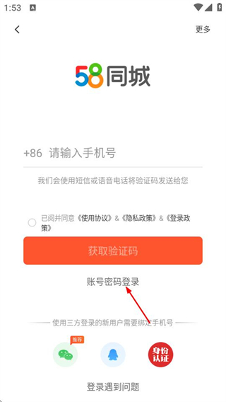 3、在登录界面,点击账号密码登录,进入账号密码登录页面。