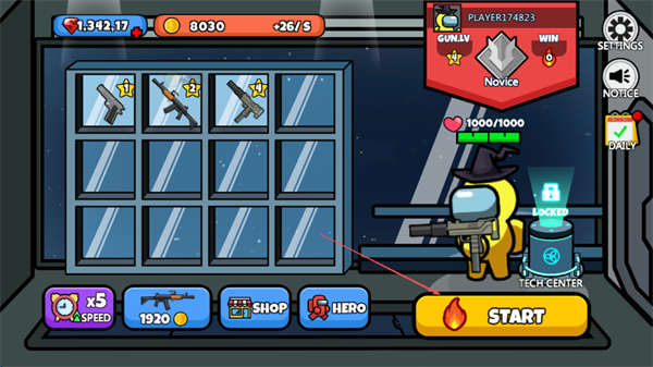 1、在武器界面解锁枪械,装备后点击START进入游戏,准备参与太空大逃杀。