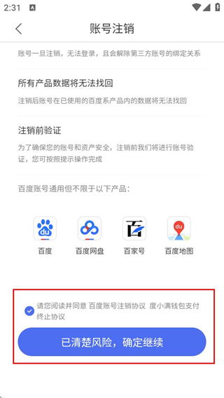 5、在账号注销页面,勾选协议后点击已清楚风险,完成注销操作。