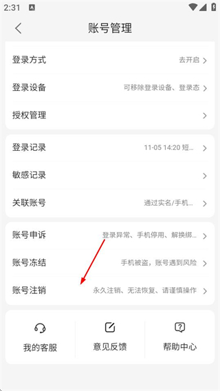 4、在账号管理页面,点击账号注销选项,进入账号注销页面。