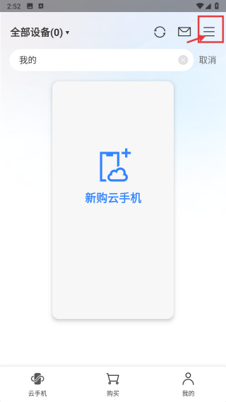 1、打开云手机类APP,点击右上角菜单图标,进入菜单页面。
