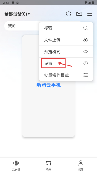 2、在菜单页面,点击设置选项,进入云手机设置页面。
