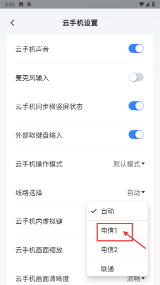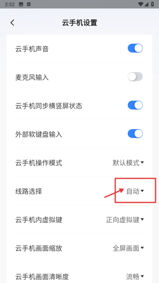3、在云手机设置页面,点击线路选择选项,弹出线路选择列表。