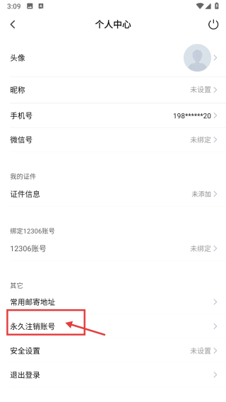 3、在个人中心页面,点击永久注销账号选项,进入账号永久注销页面。
