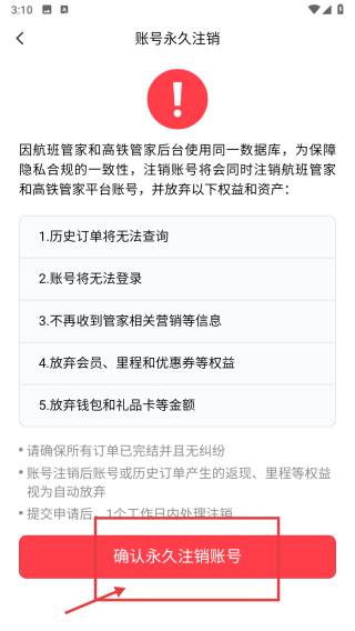 4、在账号永久注销页面,点击确认永久注销账号按钮,完成账号永久注销操作。