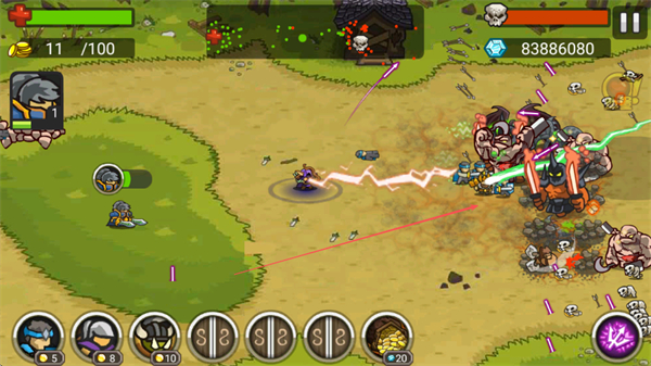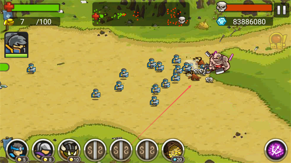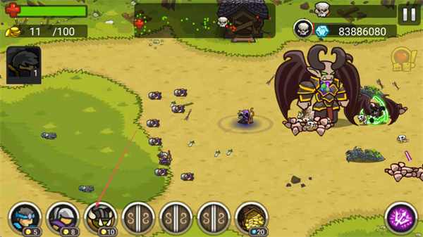 2、部署蓝色士兵,攻击地图上的巨型恶魔敌人,积累金币,提升士兵战力。