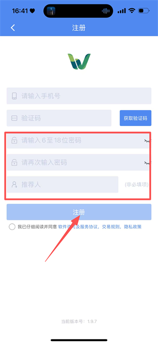 2、在注册页面,输入手机号后,点击获取验证码并输入。