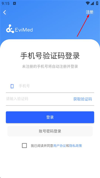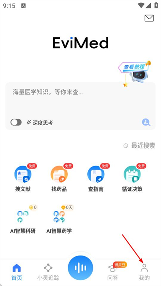 1、在EviMed首页,点击右下角我的选项,进入登录注册页面。
