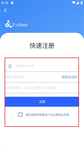 3、在快速注册页面,输入信息,勾选协议后点击注册,完成注册操作。