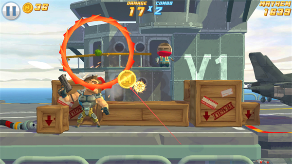 1、在航母场景中,操控角色射击敌人,命中后收集金币,积累伤害值和连击数。