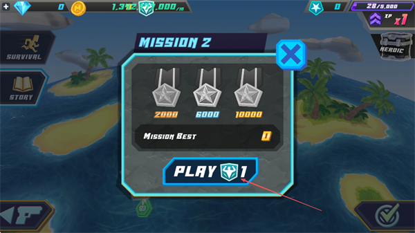 1、在任务界面选择Mission2,点击PLAY按钮进入关卡,目标积累分数获取勋章。