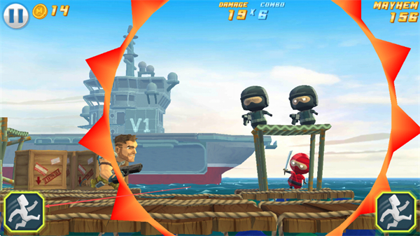 2、在木筏场景射击忍者类敌人,触发连击如19×6,积累伤害值和MAYHEM值。