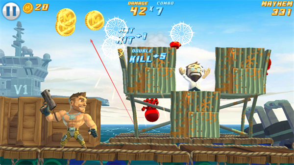 3、攻击多样敌人,达成DOUBLEKILL等成就,收集金币,提升连击数如42×7,扩大优势。