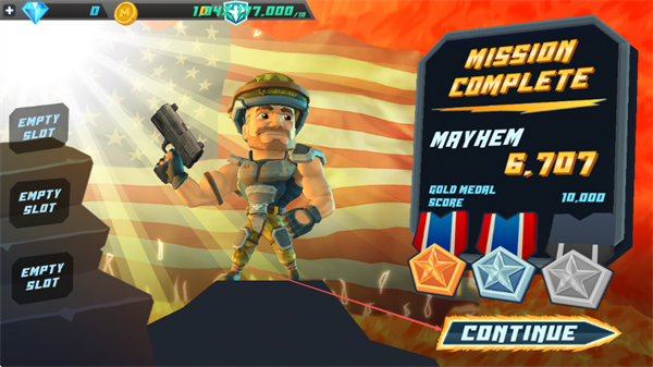 4、消灭所有敌人后,达成关卡目标,获得金牌分数10000,点击CONTINUE继续挑战。