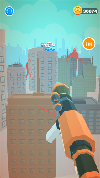 1、操控枪械瞄准城市中的红色巨人,寻找其弱点位置,准备射击。