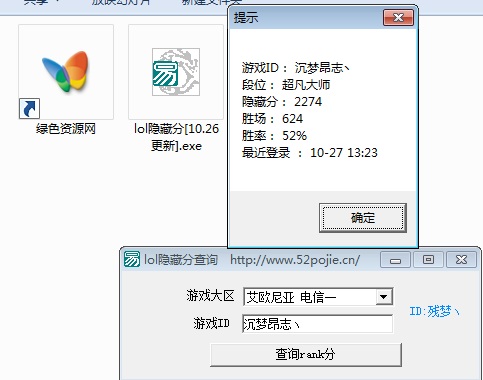游戏介绍 游戏标签: lol隐藏分 英雄联盟 lol隐藏分查询工具是一款最新的隐藏分查询工具,很多老版本的查询工具都因为英雄联盟系统的更新导致没有效果了,但是这一款是最新适配当前版本的,小编还亲测了一下,确实是可以用的。lol隐藏分是什么?lol隐藏分是英雄联盟对个人实力的判定,如果你的隐藏分越高那么你每局胜利后获得的胜点也就越高,还可以获得跳段的奖励,当然如果你段位低那么加的分就少,不过可以通过连胜了提高LOL的隐藏分。使用说明打开lol隐藏分查询选择自己所在的区域,输入游戏ID即可查询rank分数 解压密码:www.downcc.com 游戏截图 上一张下一张(1 / 1) 安装详细截图 猜你喜欢 隐藏分查询 隐藏分查询 LOL隐藏分一般是段位重置后个段位玩家独有的隐藏分数,之前连胜高,段位高的玩家自然隐藏分越高,而在新赛季中,隐藏分高的玩家所匹配的对手也会更强,相对应的,玩家在最终获胜后的定级自然也会更高,那么今天小编就为大家带来LOL隐藏分查询工具,欢迎大家在绿色资源网下载体验。 查看更多>> 战斗力探测器软件 0KB/中文/10.0/v1.0 安卓版下载 网易荒野行动战绩查询工具 0KB/中文/3.3/v1.0 安卓版下载 绝地求生战绩查询软件 0KB/中文/10.0/v1.0.10 安卓版下载 300英雄战绩查询软件 0KB/中文/10.0/v1.0 安卓版下载 嗨妖妖11对战平台战绩查询app苹果版 0KB/中文/10.0/v1.0 iphone官网版下载 懿菲云LOL战斗力隐藏分查询器 380KB/中文/10.0/v1.0 免费版下载 其他版本下载 标题 大小 更新日期 下载 下载地址 电脑版 lol隐藏分查询工具 最新版 点击报错 软件无法下载或下载后无法使用,请点击报错,谢谢! 关闭报错反馈 请描述您所遇到的错误,我们将尽快予以修正,谢谢! *必填项,请输入内容 本类最新 雷电云手机pc版 v3.6.0 官方最新版 炉石传说掌游宝电脑版 v3.1.11 官方pc版 魔兽世界助手黑盒工坊 v1.9.21.1 云帅云手机pc最新版 v1.3.7 官方版 腾讯云游戏平台start v0.11.0.18627 免费官方版 红手指云手机电脑版 v4.02.003 官方最新版 相关文章 英雄联盟lol名词解释 AP、AD、ADC、DPS什么意思 局域网隐藏计算机能上网设置 ASP中查询数据库记录写入XML文件示例 ASP隐藏下载地址及防盗代码 Apache之AllowOverride参数详解 删除隐藏在 Vista 系统服务中的病毒 用户评论 热门评论 最新评论 发表评论 查看所有评论(0) 昵称: 请不要评论无意义或脏话,我们所有评论会有人工审核. 字数: 0/500 (您的评论需要经过审核才能显示)