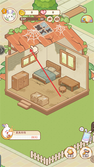 1、跟随指引点击房屋上的蛛网进行修缮。