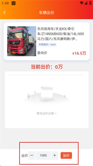 4、在车辆出价页面,可设置出价金额后点击加价,参与车辆竞价。