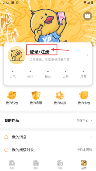 2、在个人中心,点击登录/注册区域,进入登录界面。