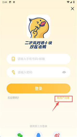 3、在登录界面,点击新用户注册选项,切换至账号注册页面。
