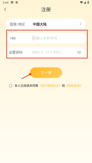 4、在账号注册页面,输入手机号码、设置密码,勾选协议后点击下一步按钮,完成账号注册操作。