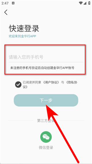 3、在快速登录页面,输入手机号,勾选协议后,点击下一步。
