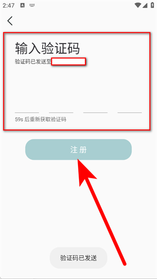 4、在输入验证码页面,输入收到的验证码后,点击注册。