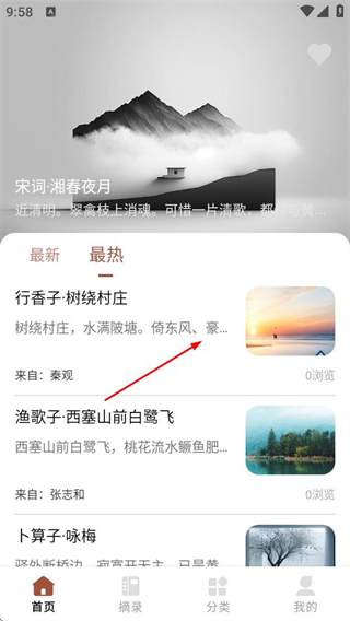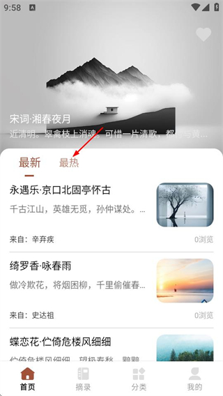 1、点击最热标签,可切换查看热门宋词内容,如各种名人古诗等。
