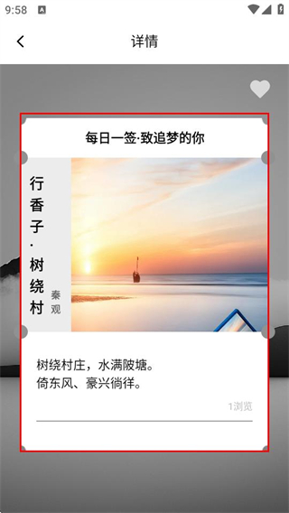 支持一键收藏喜爱的诗作与解读内容,生成带有古典美学设计的分享卡片,便于用户随时重温经典,向亲友传递古典文学魅力与文化温度。