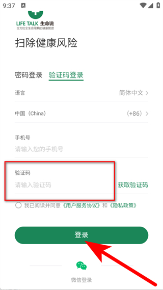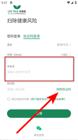 3、在登录页面,输入手机号码,点击获取验证码。