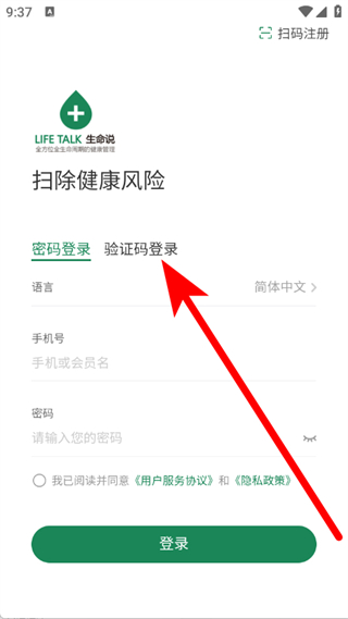 2、在登录界面,选择验证码登录方式,进入页面。