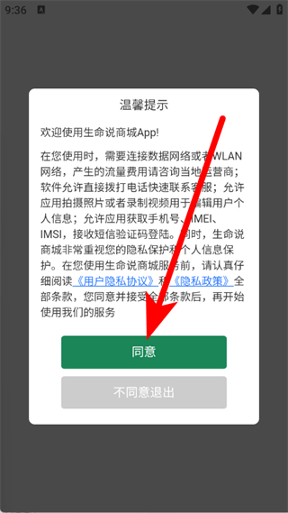 1、打开生命说商城,在弹窗中,点击同意,进入登录界面。