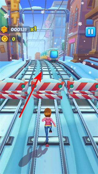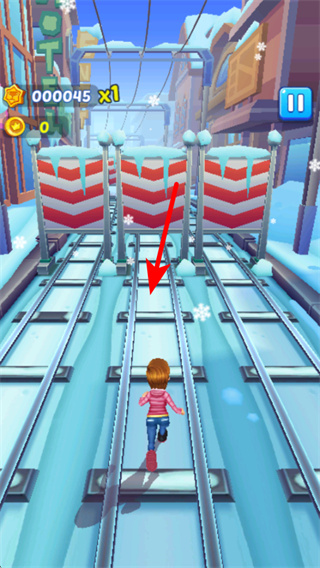 1、在游戏中,沿着轨道方向奔跑前进,方向把控是跑酷的关键操作,稳定移动,避免因偏离轨道导致游戏失败。