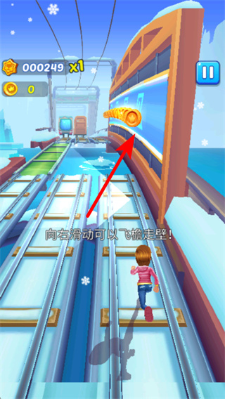 4、按照提示滑动屏幕进行飞檐走壁操作,执行获取资源的重要操作,在特殊场景中移动并收集金币,提升收益。