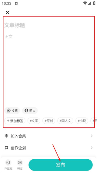 3、在文字创作编辑界面填写文章标题和正文,添加标签等后点击发布即可发布文字内容。