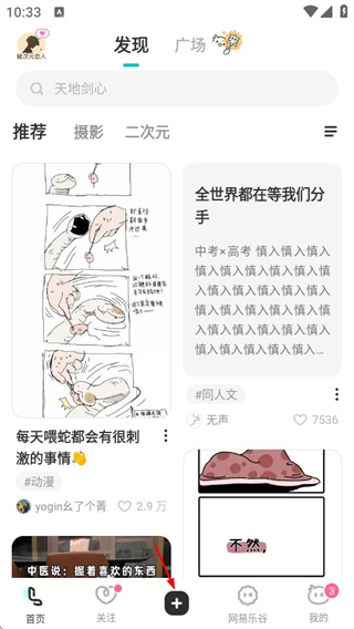 1、在发现页面点击底部加号按钮,进入创作选择界面。