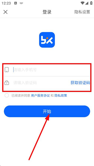 3、在登录页面,输入手机号和验证码,点击开始,完成登录操作。