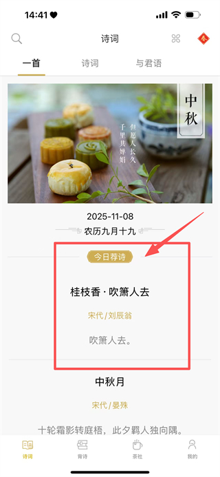 1、在诗词首页,点击今日荐诗中的诗词条目,进入诗词详情页面。