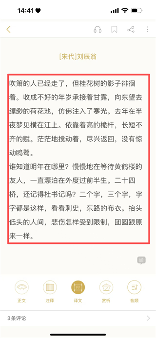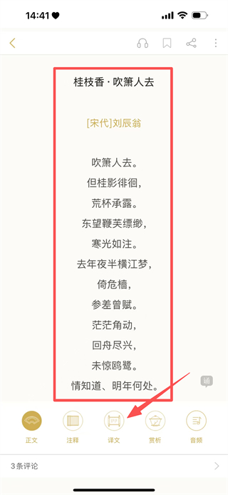 2、在诗词详情页面,点击底部译文的按钮,切换到译文展示界面。