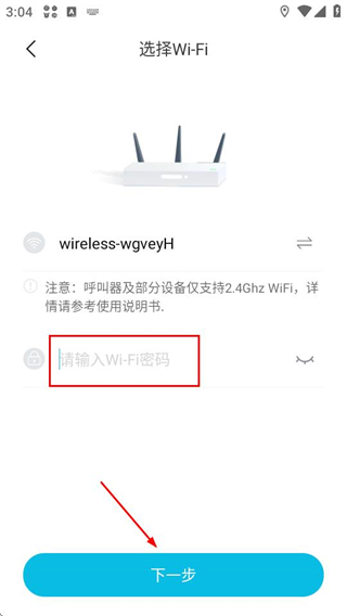 4、在Wi-Fi连接界面输入家庭Wi-Fi密码,点击下一步进入设备配对界面。