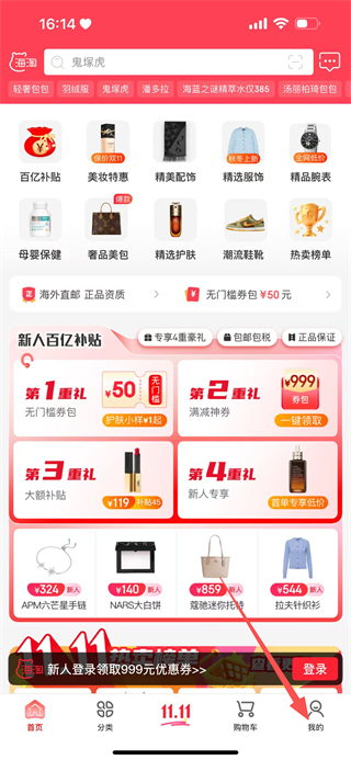 1、在海淘APP首页,点击底部我的,进入个人页面。