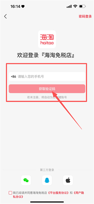 3、在手机号登录页面,输入手机号后点击获取验证码。