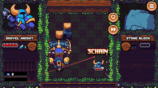 2、控制铲子骑士移动,靠近方块区域进行消除,形成连锁反应如3CHAIN可获得额外奖励。