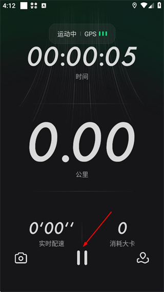 3、在运动中界面可查看运动距离和时间,点击暂停键可暂停运动。