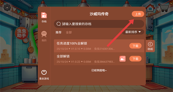 2、存档管理界面点击“上传”,进入存档上传页面。