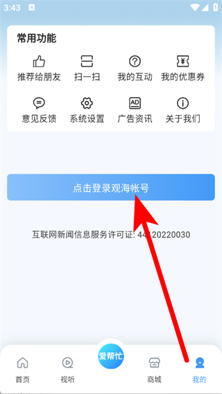 2、在个人中心页面,点击登录观海帐号,进入登录界面。