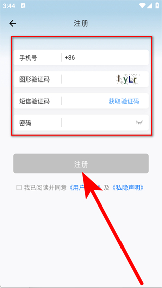4、填写手机号、图形验证码,点击获取验证码,勾选同意协议后,点击注册按钮,完成注册。