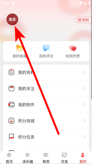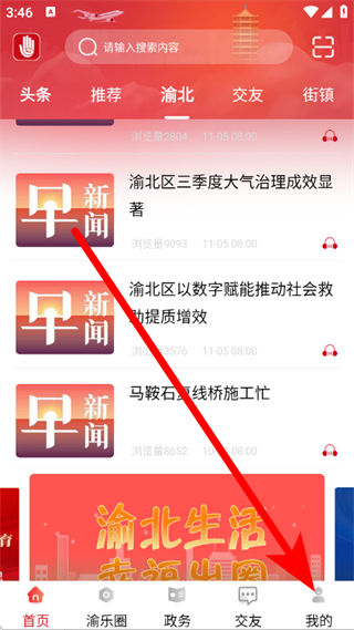 1、打开渝北掌媒,在首页点击底部我的,进入我的页面。