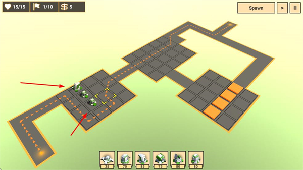 1、在地图关键路径旁部署防御塔,组成初始防御阵型,开启敌人防御进程。