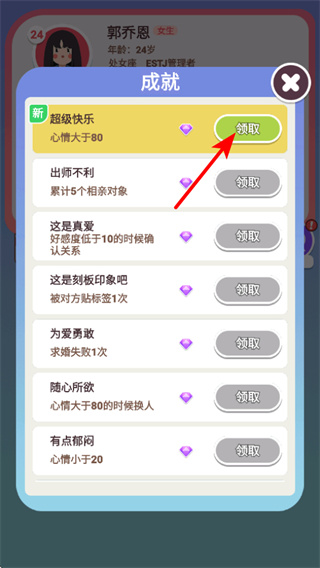 3、在游戏中领取成就奖励,奖励领取是积累资源的关键环节,领取后可获取钻石等资源,助力角色发展和恋爱进程。